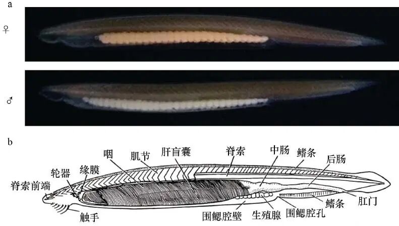 a. 青岛文昌鱼照片;b. 文昌鱼示意图(左侧观),示主要结构
