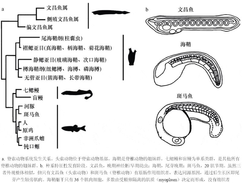 a. 文昌鱼;b. 海鞘幼虫;c. 七鳃鳗幼体;d. 哺乳类胚胎