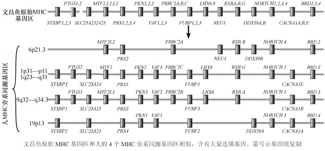 图13-14 文昌鱼的原始MHC 基因区和人4 个MHC 旁系同源基因区比较
