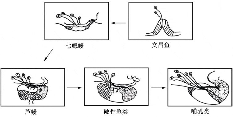 图2-3 文昌鱼、海鞘幼虫、七鳃鳗幼体和哺乳类胚胎比较