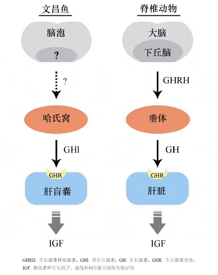 从组织学上可以确定文昌鱼哈氏窝是脊椎动物脑垂体的前体,肝盲囊是肝脏的前体。从分子水平上可以确定文昌鱼中不但存在类似于脊椎动物GH-GHR 的分子组合GHl-GH/PRLlBP,而且存在类似于脊椎动物的IGFl-IGFR 分子组合。尤为重要的是,文昌鱼GHl 可以通过与GH/PRLlBP 结合,调节肝脏IGF 及肝盲囊IGFl 的表达。因此,文昌鱼中存在着类似于脊椎动物的GH-IGF 信号系统,或者说文昌鱼中存在类似于脊椎动物的垂体-肝脏轴,即哈氏窝-肝盲囊轴。