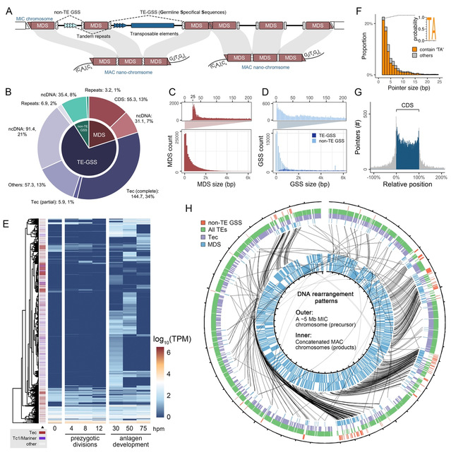 在本研究中,课题组成员进一步通过PacBio高通量测序技术完成了对该海洋纤毛虫生殖系基因组的高质量测序和组装,发现其中超过80%的序列为转座子等生殖系特异性序列,并且这些片段大多插在基因编码区,因此必须在体细胞核发育过程中被精确删除。