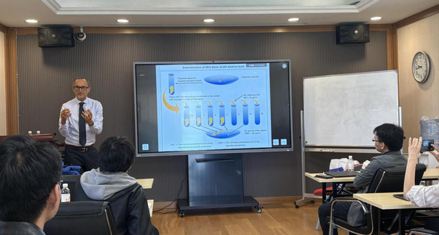 Giorgi教授围绕其核心研究领域,深入浅出地为同学科普了不同动物物种的PK/PD特性研究在兽医毒理学和药效学中的应用。他以抗菌药物关键药效指标为切入点,系统解读了最低抑菌浓度(MIC)、最低杀菌浓度(MBC)的测定方法与临床意义,通过具体实验数据展示了AUC/MIC 等 PK/PD 指数对疗效的决定性作用。结合实际应用案例,教授对比了时间依赖性与浓度依赖性抗菌药物的作用差异,强调需根据药物类型优化给药方案。团队研究让基础科研成果能直接服务于动物疾病治疗,为抗菌药物的合理使用、耐药性防控提供科学参考,助力兽医诊疗行业规范化。