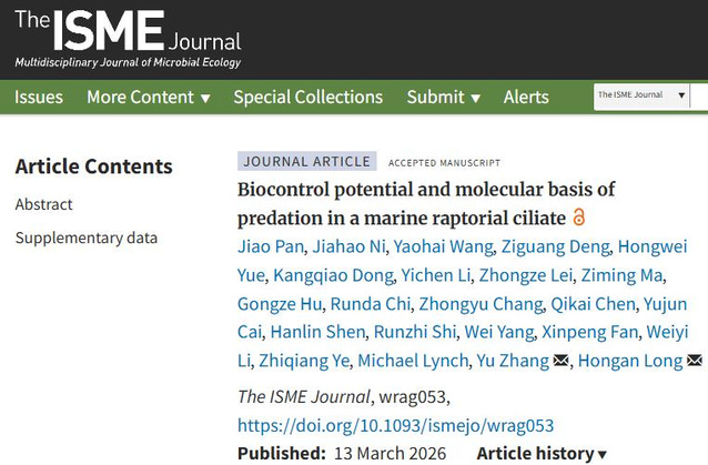 2026年3月13日,中国海洋大学进化所/水产学院龙红岸团队联合斯坦福大学、亚利桑那州立大学、华东师范大学等国内外多家科研机构,在The ISME Journal上发表了题为 Biocontrol potential and molecular basis of predation in a marine raptorial ciliate的研究。该研究从近海环境中成功分离并建立了以捕食性纤毛虫贪食纤口虫Chaenea vorax 为捕食者、条件致病性纤毛虫海洋尾丝虫Uronema marinum 为猎物的海洋原生动物捕食模型,全面揭示了掠食性海洋纤毛虫高效捕食的群体动力学及分子适应机制,并系统评估了其作为水产养殖生物防控株系的应用潜力。