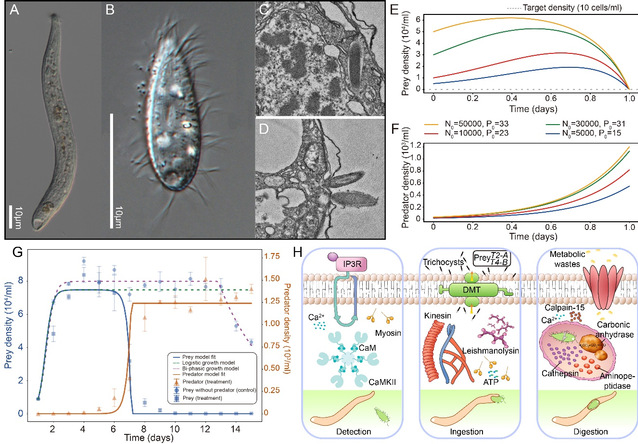 研究团队首先通过捕食实验与Rosenzweig–MacArthur模型模拟,发现贪食纤口虫C. vorax具有极高的捕食效率:仅需几十个捕食者个体,即可在1–2天内消灭绝大多数海洋尾丝虫U. marinum种群。这一结果不仅揭示了其在种群层面的强大控制能力,也为后续生物防控策略的定量化设计奠定了理论基础。进一步研究发现其捕食行为涉及钙离子介导的细胞收缩、溶蛋白酶解系统以及毒素外排机制,以及细胞骨架重塑、蛋白水解及解毒等,显示其捕食行为是一个高度协调的分子过程。