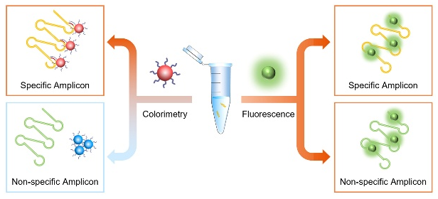 图2. Nano-LAMP高特异性检测机制及其与荧光PCR或LAMP的对比示意图。