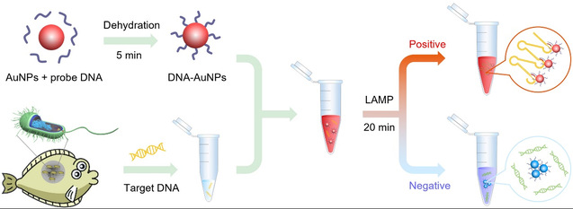 图1. 利用纳米探针增强Nano-LAMP方法示意图,用于鳗弧菌感染大菱鲆的快速可视化检测。