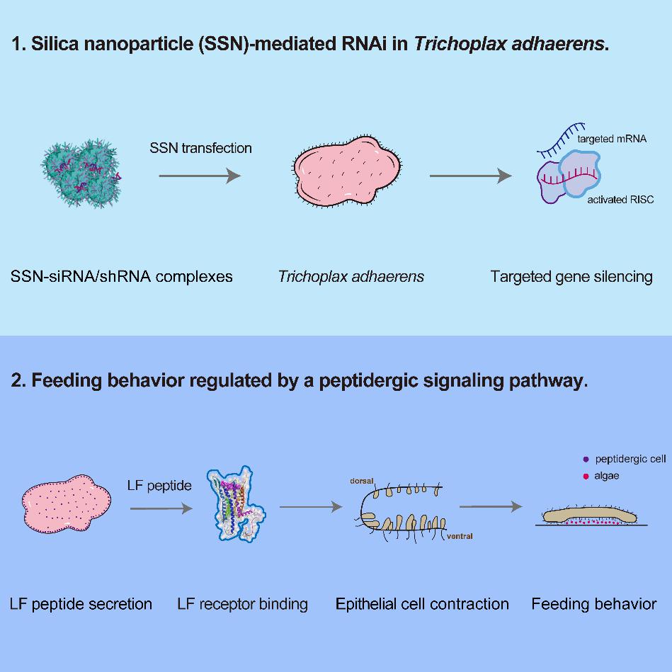 进化所赵呈天教授团队在国内首次建立了丝盘虫培养技术体系,并初步解析了丝盘虫细胞互作的关键信号通路(Nature Communications,2024)。为解决丝盘虫基因编辑技术的难题,课题组与校内多个团队深入合作,初步建立了丝盘虫的基因敲降及转基因等基因编辑技术。近日,著名学术期刊Current Biology在线发表了题为“Decoding the Peptidergic Signaling Pathway in Trichoplax adhaerens through the Development of a Gene Silencing Method”的研究论文,报导了课题组在丝盘虫基因敲降技术体系开发方面取得的新进展。