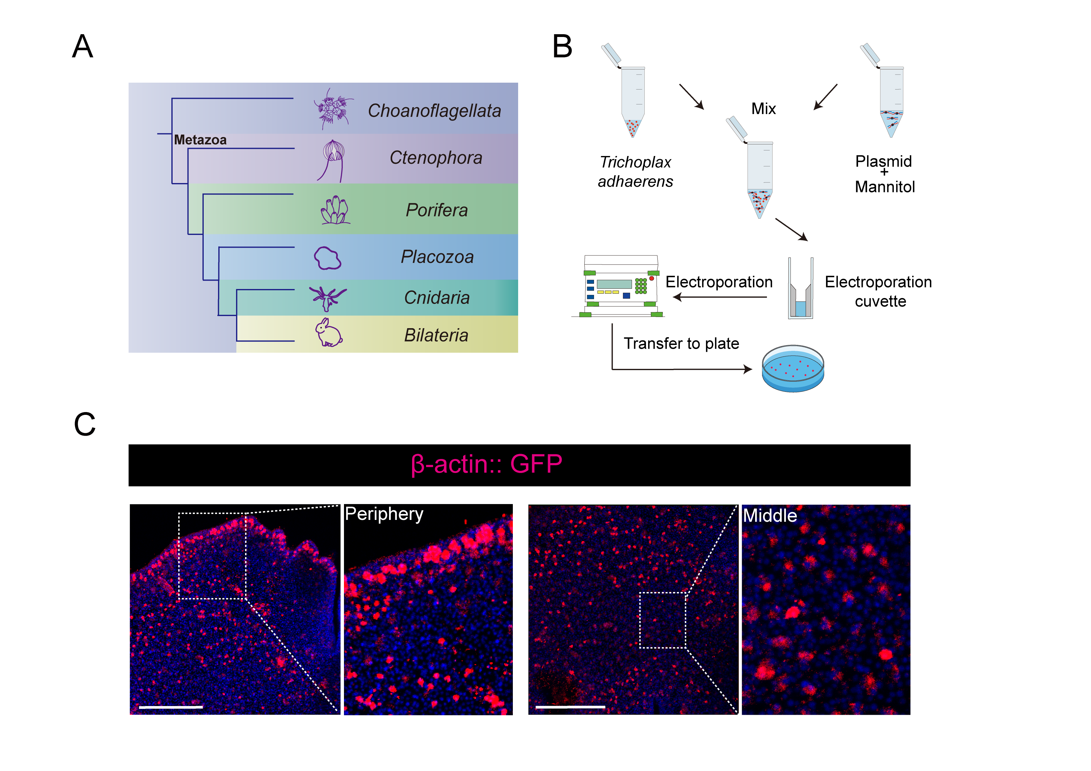 此外,课题组近期还在动物学期刊Zoological Research在线发表了题为“Establishment of transgenic method in Trichoplax adhaerens”的研究论文,报导了课题组在丝盘虫中建立转基因技术的尝试。研究人员通过筛选,建立了一种基于电转染方式,在丝盘虫瞬时表达外源基因的转基因方法。同时,筛选到了丝盘虫内源高效表达的启动子,为未来构建稳定转基因品系提供了潜在策略。