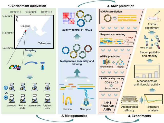 海洋附生微生物群落作为微生物最密集、相互作用最活跃的载体,所蕴含的庞大未知物种与基因资源,迄今仍有待通过培养组学、单细胞技术与宏基因组学等手段进行系统性地挖掘与开发。为填补这一研究空白,中国海洋大学张伟鹏教授团队以青岛近海岩石表面附生微生物群落为对象,经138种碳源-氧浓度富集培养,结合宏基因组测序获得435个低丰度稀有(相对占比低于万分之一)菌株高质量基因组(图1)。通过双机器学习模型筛选,鉴定出305万余候选抗菌肽,其中1048个高可信度肽段具有独特序列与结构特征,展现出强耐酸碱性、抗蛋白酶水解性及低细胞毒性。实验证实其通过破坏病原菌细胞膜发挥作用,对多重耐药金黄色葡萄球菌等临床致病菌抑制效果显著,在小鼠感染模型中也表现出良好体内抗感染活性。该研究为新型抗菌药物研发提供了珍贵资源,也为从微生物暗物质中挖掘生物活性代谢物提供了新范式。相关成果发表于Microbiome(微生物学1区top期刊,IF=12.6)。中国海洋大学张伟鹏教授、丁维副教授为通讯作者,博士研究生范燊、卢洁为第一作者(图2)。