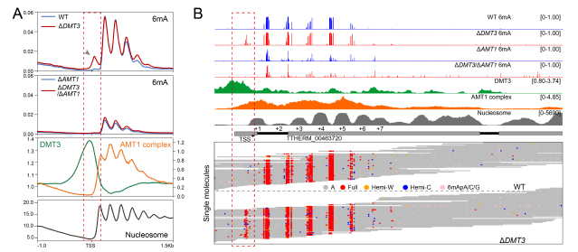 图3. DMT3去除AMT1在TSS处添加的6mA。(A)6mA、DMT3、AMT1复合体以及核小体的基因组分布特征;(B)代表性基因座的6mA、DMT3、AMT1复合体以及核小体分布特征。