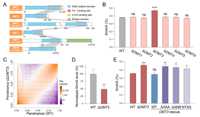 图1. DMT3是6mA去甲基化酶。(A)DMT1-6具有AlkB家族的保守结构域;(B)DMT3敲除株系整体6mA水平显著上升;(C)DMT3敲除株系中部分腺嘌呤位点的6mA水平显著上升;(D)DMT3敲除株系的6hmA水平显著下降;(E)野生型DMT3回补使6mA水平恢复,而突变DMT3回补则不能使6mA水平恢复。