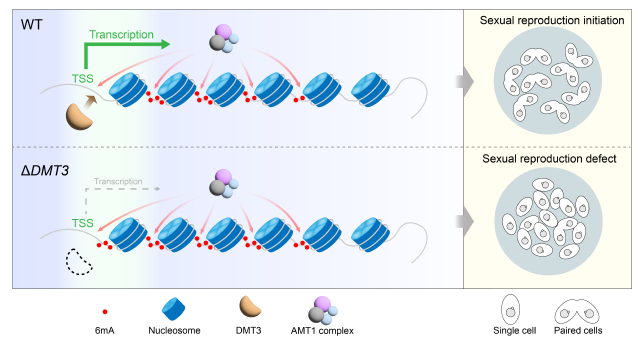 与此同时,本研究的发现也为系统性比较真核生物中两种主要的DNA甲基化修饰6mA与5-甲基胞嘧啶(5mC)提供了新的维度。传统观点认为,多细胞真核生物的5mC与单细胞真核生物的6mA功能相反:5mC与转录抑制相关,而6mA则与转录激活关联。然而,越来越多证据表明,启动子区域的5mC抑制转录,而基因内部的5mC常与活跃转录相关。单细胞真核生物中的6mA大多富集在TSS下游并发挥转录激活作用,而本研究发现TSS附近的异常6mA则倾向于抑制转录。因此,5mC与6mA或许并非如传统观点所认为的功能对立,而是可能遵循着相似的调控逻辑:DNA甲基化的转录效应取决于其在基因组中的位置。这一认识不仅深化了对6mA功能机制的理解,也为探讨DNA修饰在真核生物演化过程中的功能保守性与分化提供了全新视角。
