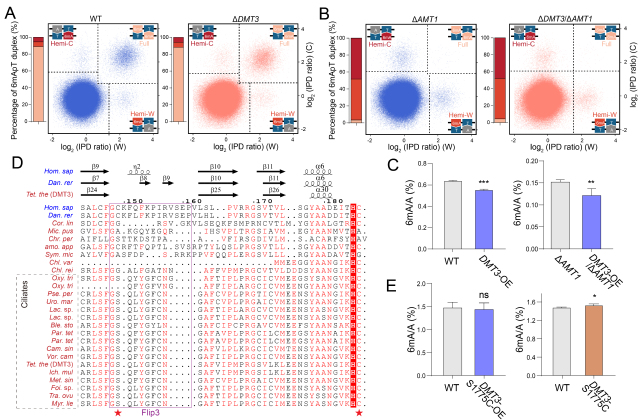 图2. DMT3作用于全甲基化和半甲基化的6mApT。(A)野生型和DMT3敲除株系的6mApT都主要是全甲基化状态;(B)AMT1敲除和AMT1、DMT3双敲除株系的6mApT都主要是半甲基化状态;(C)在野生型(全甲基化位点为主)和AMT1敲除(半甲基化状态为主)株系中过表达DMT3都能使6mA水平显著下降;(D)与多细胞动物ALKBH5同源蛋白相比,纤毛虫ALKBH5同源蛋白的Flip3区域存在天然的半胱氨酸到丝氨酸的替换;(E)DMT3-S1775C过表达不能使6mA显著下降,DMT3-S1775C突变使6mA显著上升。
