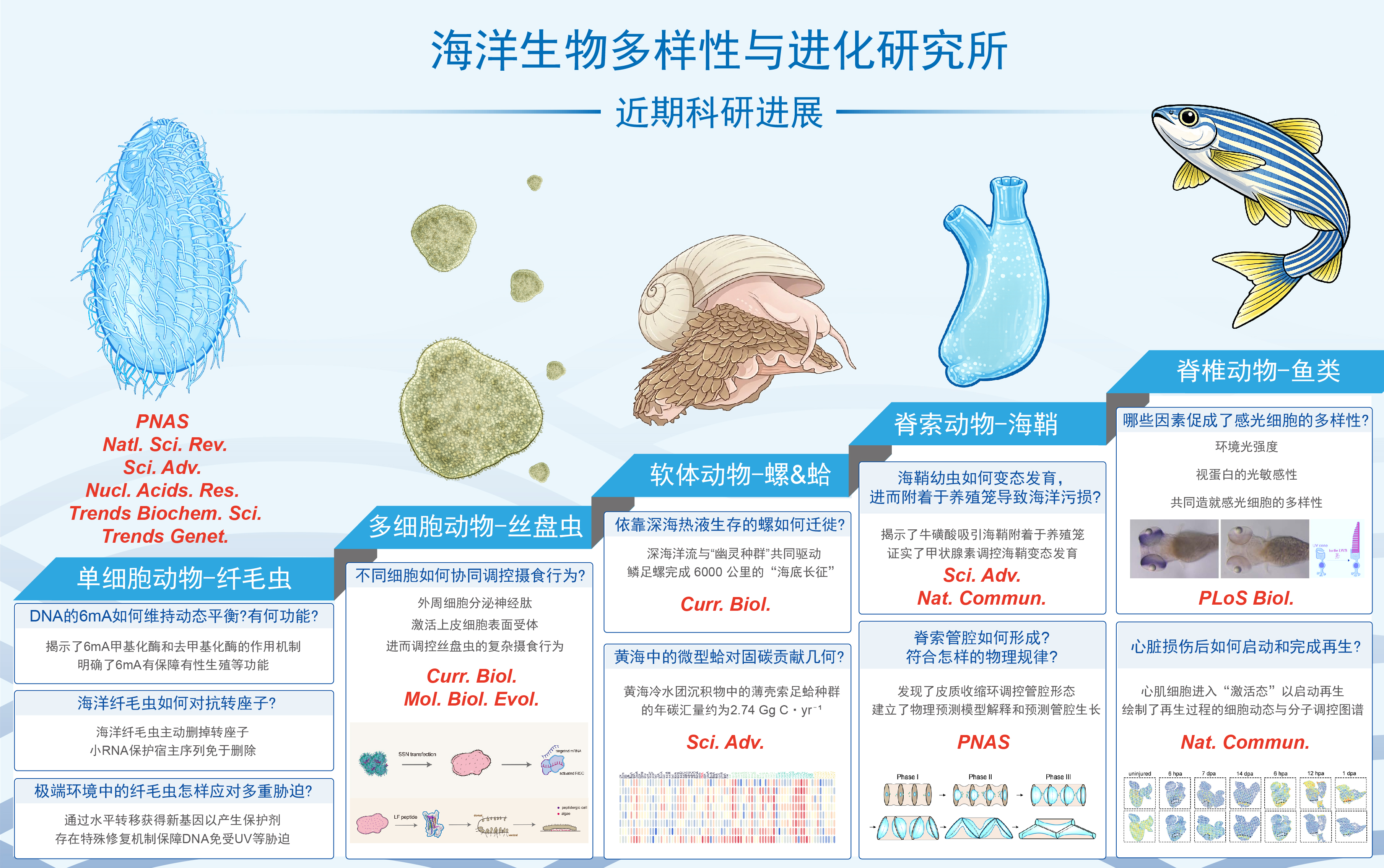 遵循“博观约取、厚积薄发”的所训,海洋生物多样性与进化研究所在过去的一年中,团队间同心联袂、互为灯火,围绕基础生命科学的前沿分支,特别是在纤毛虫微观生物学、基因调控、细胞通讯、发育机制及演化-适应等方向,收获了多份具有显著领域影响力的成果和研究进展。