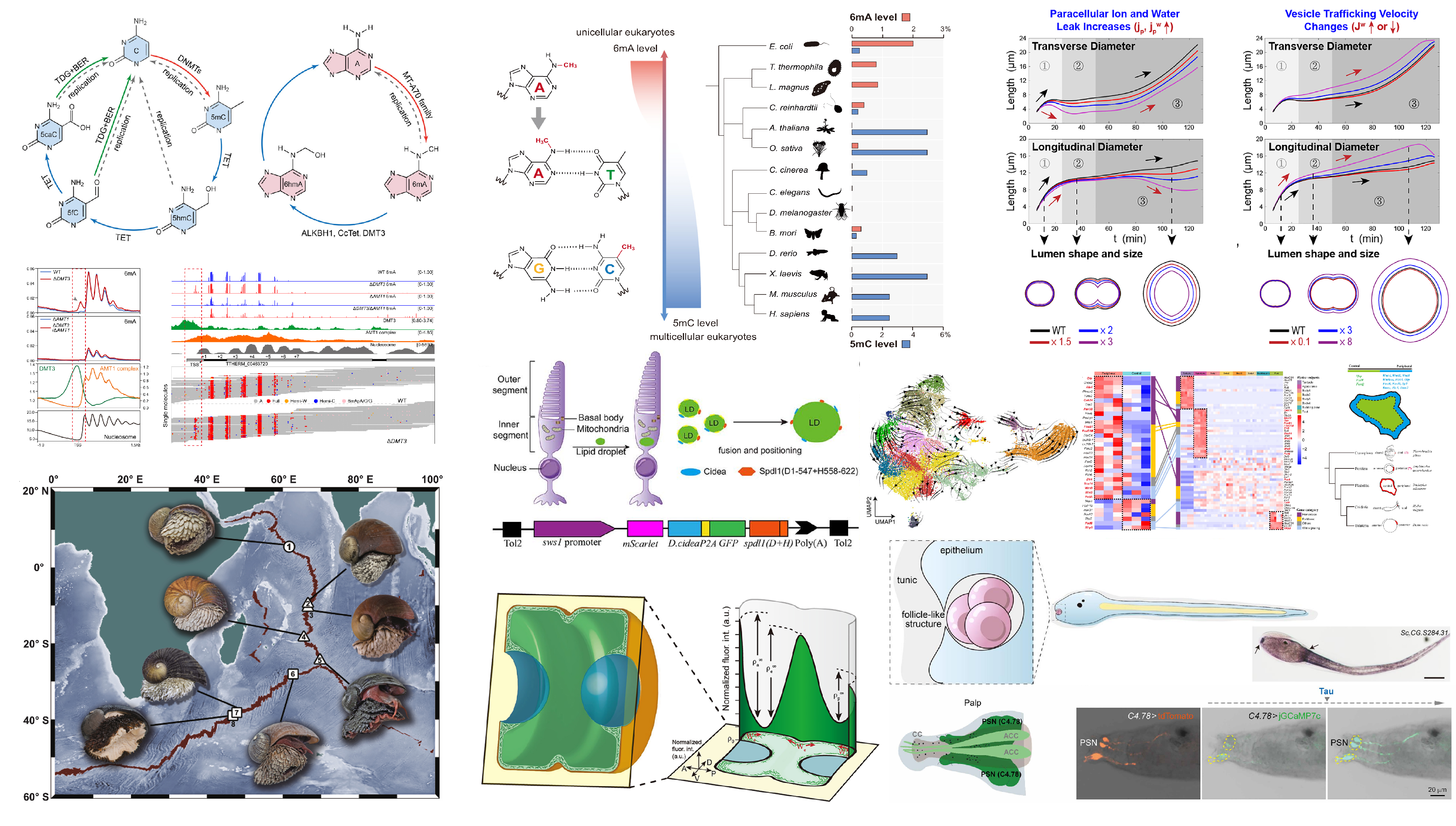 围绕DNA N6-甲基腺嘌呤(6mA)的调控机制和生物学功能,原生动物学团队以四膜虫为材料,揭示和描绘了6mA维持甲基化酶 AMT1的自调控模式,以及甲基化酶复合体通过整合转录和复制信号维持6mA稳定遗传的分子机制。此外,团队还首次发现了单细胞真核生物特有的6mA从头甲基化酶AMT2/AMT5以及去甲基化酶DMT3,并进一步揭示了其在基因调控、染色质重塑及有性生殖过程中扮演的关键角色。团队还围绕纤毛虫基因组稳定性维持及转座子调控、小RNA介导的跨代遗传信息传递的机制等科学问题,研究刻画了扇形游仆虫有性生殖过程中产生的一类特异性小RNA,阐释了其识别-保护非转座子序列、指导体细胞核中转座子序列精准删除的分子机制,为理解真核生物中基因组稳定性维持提供了新证据。